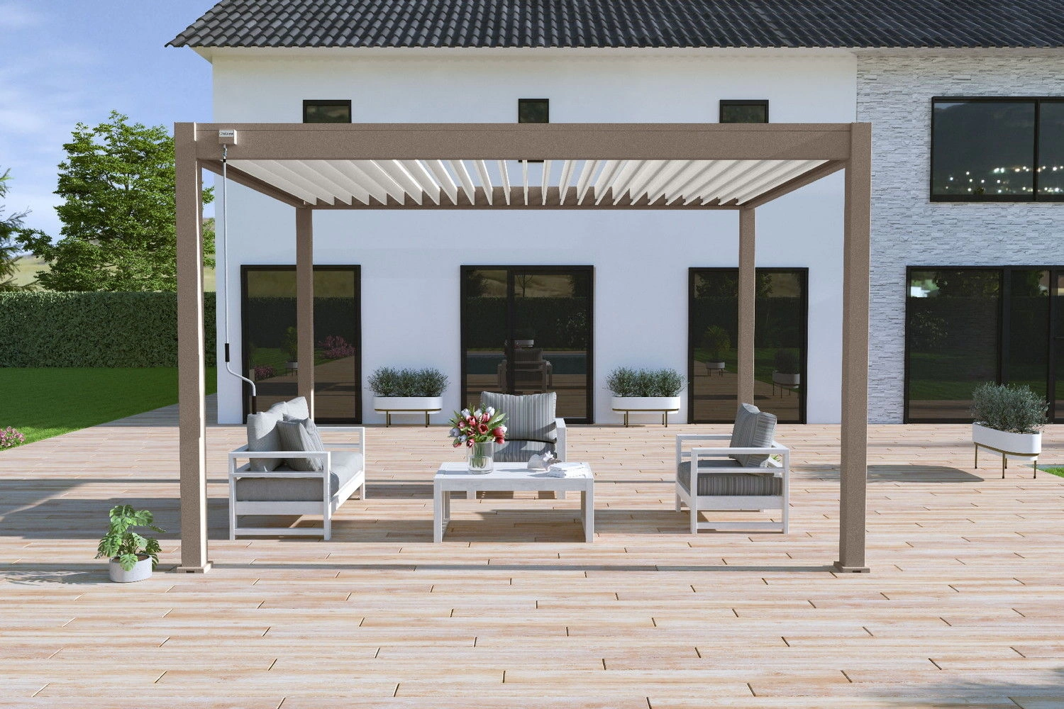 Par temps de pluie, l’espace sous la pergola restera au sec car son toit est totalement étanche, l’eau s’évacue à travers les poteaux par un système de drainage innovant.